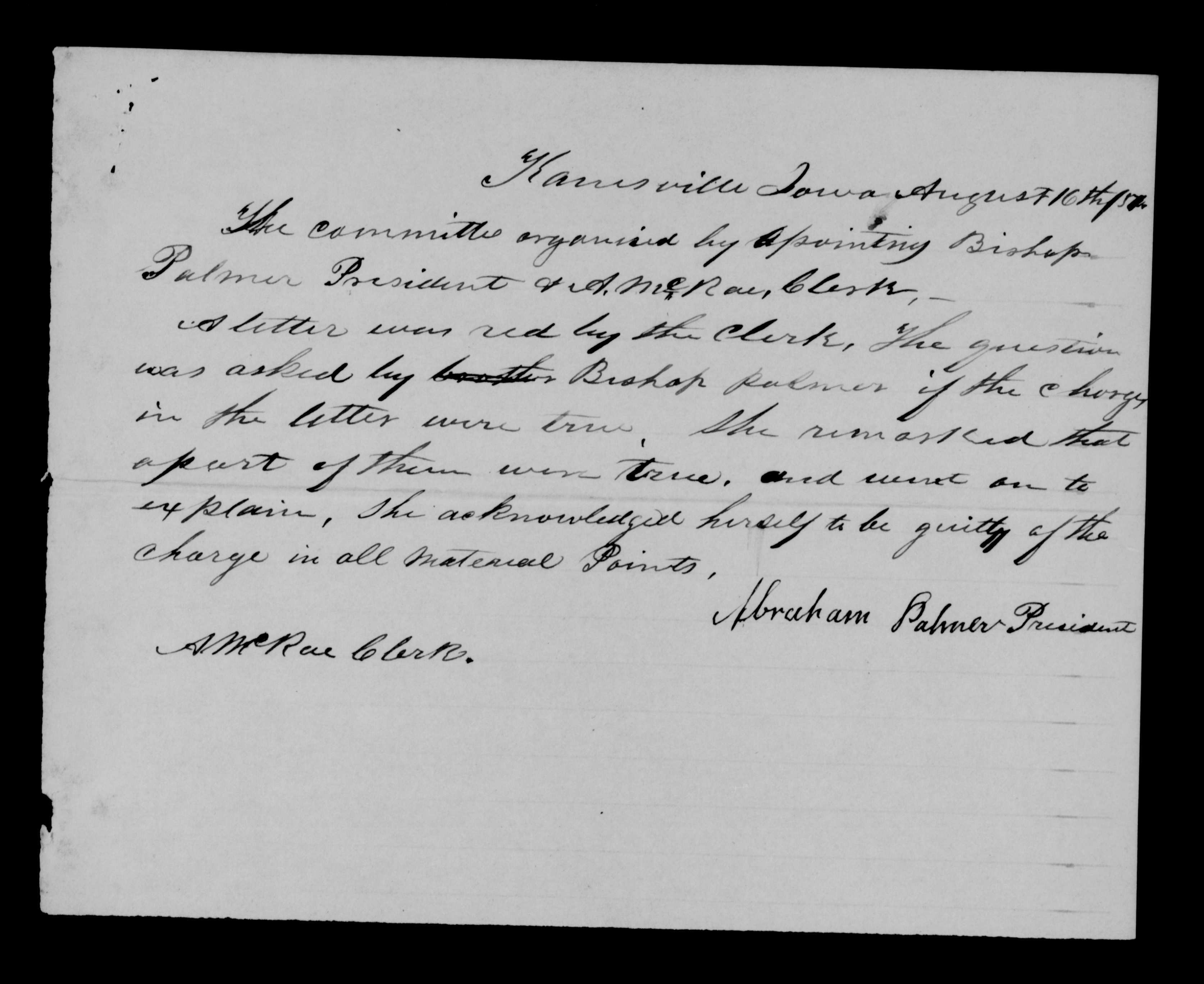 Palmer President &A[lexander] Mc Ray Clerk--