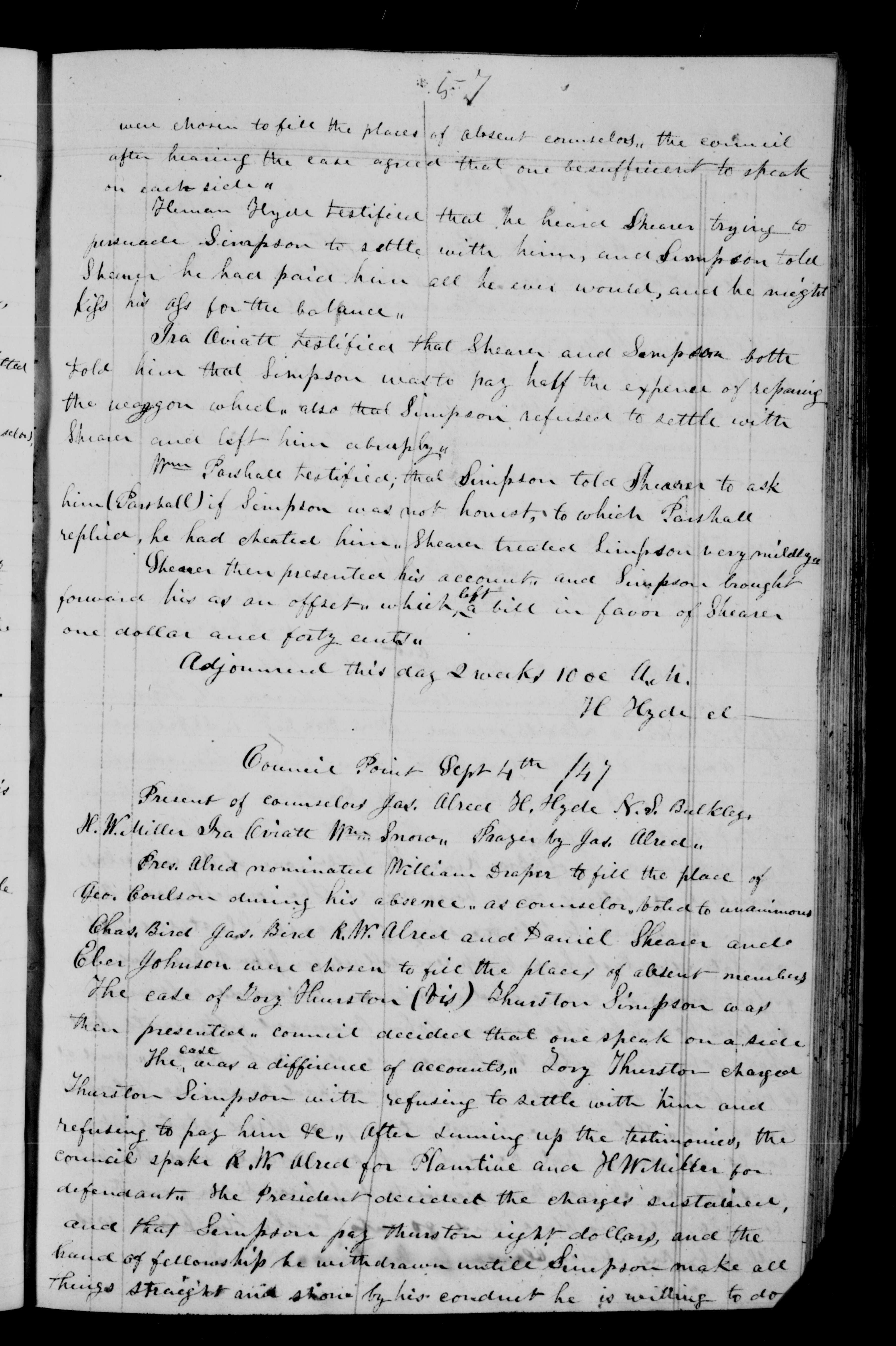 Shearer then presented his account,, and Simpson brought foreward his as an offset,, which left a bill in favor of Sheaer one dollar and forty cents..