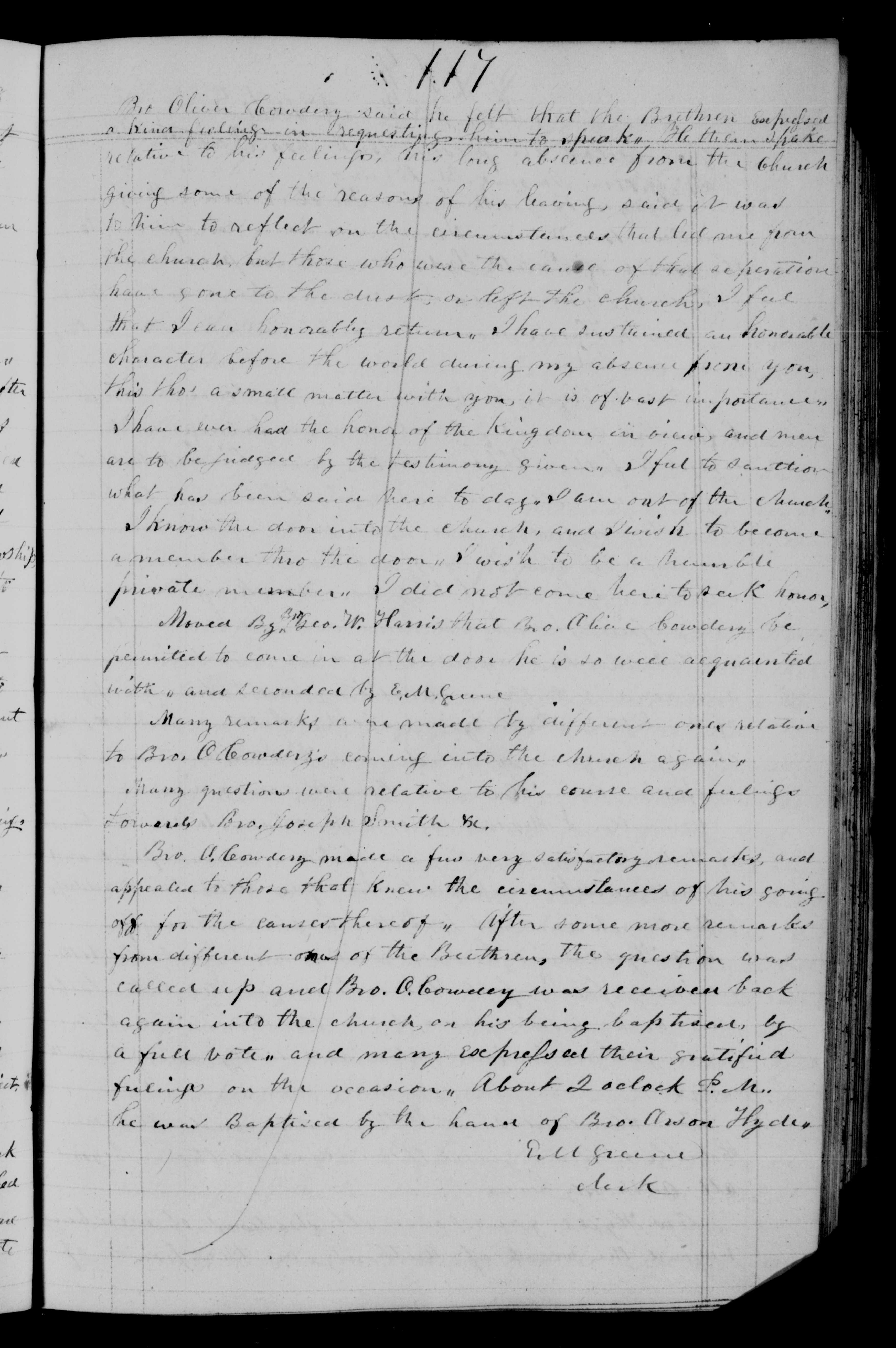Moved by Bro. Geo. W. Harris that Bro. Oliver Cowdery be