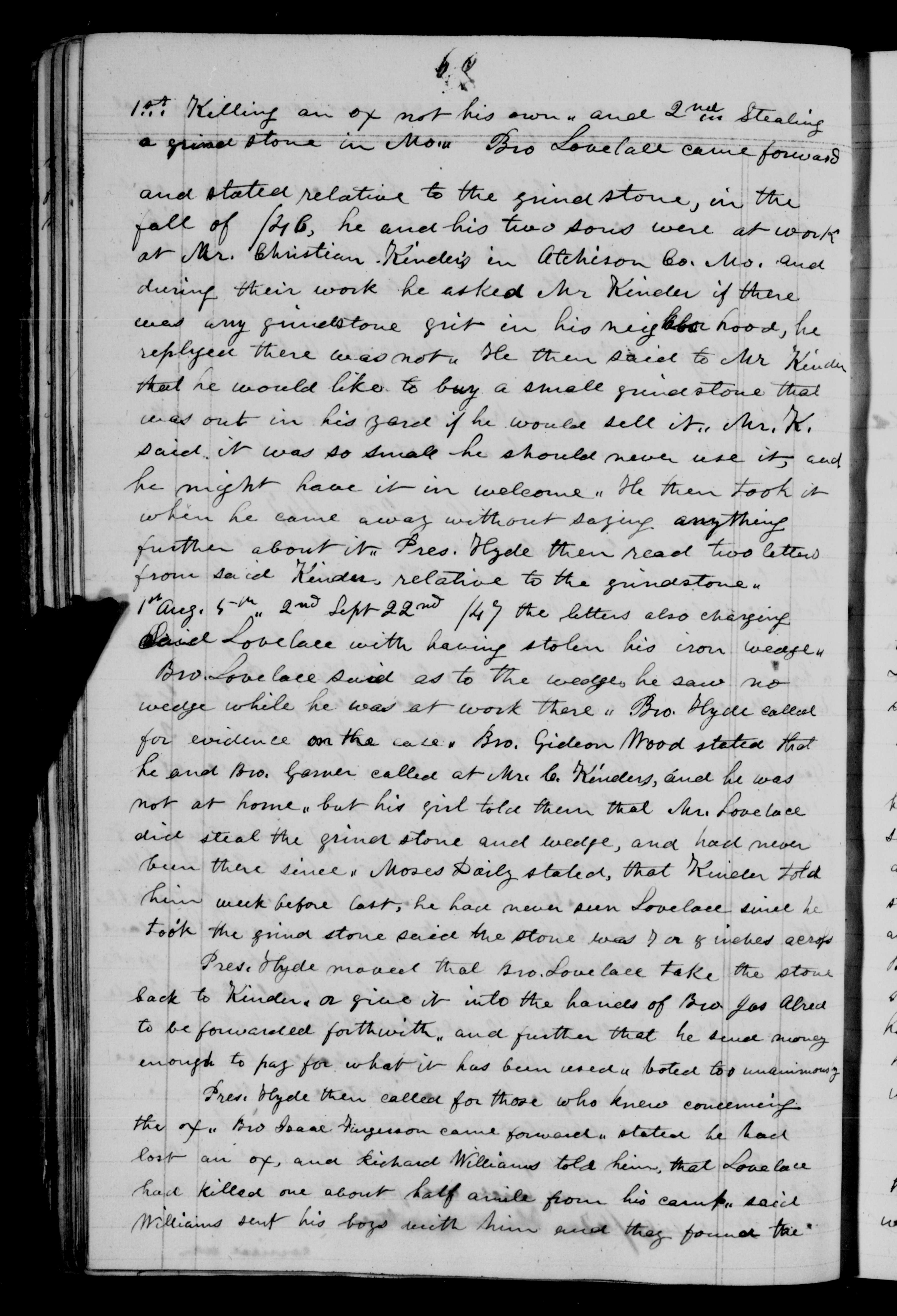 Pres. Hyde moved that Bro. Lovelace take the stone back to Kinder, or give it into the hands of Bro Jas Alred