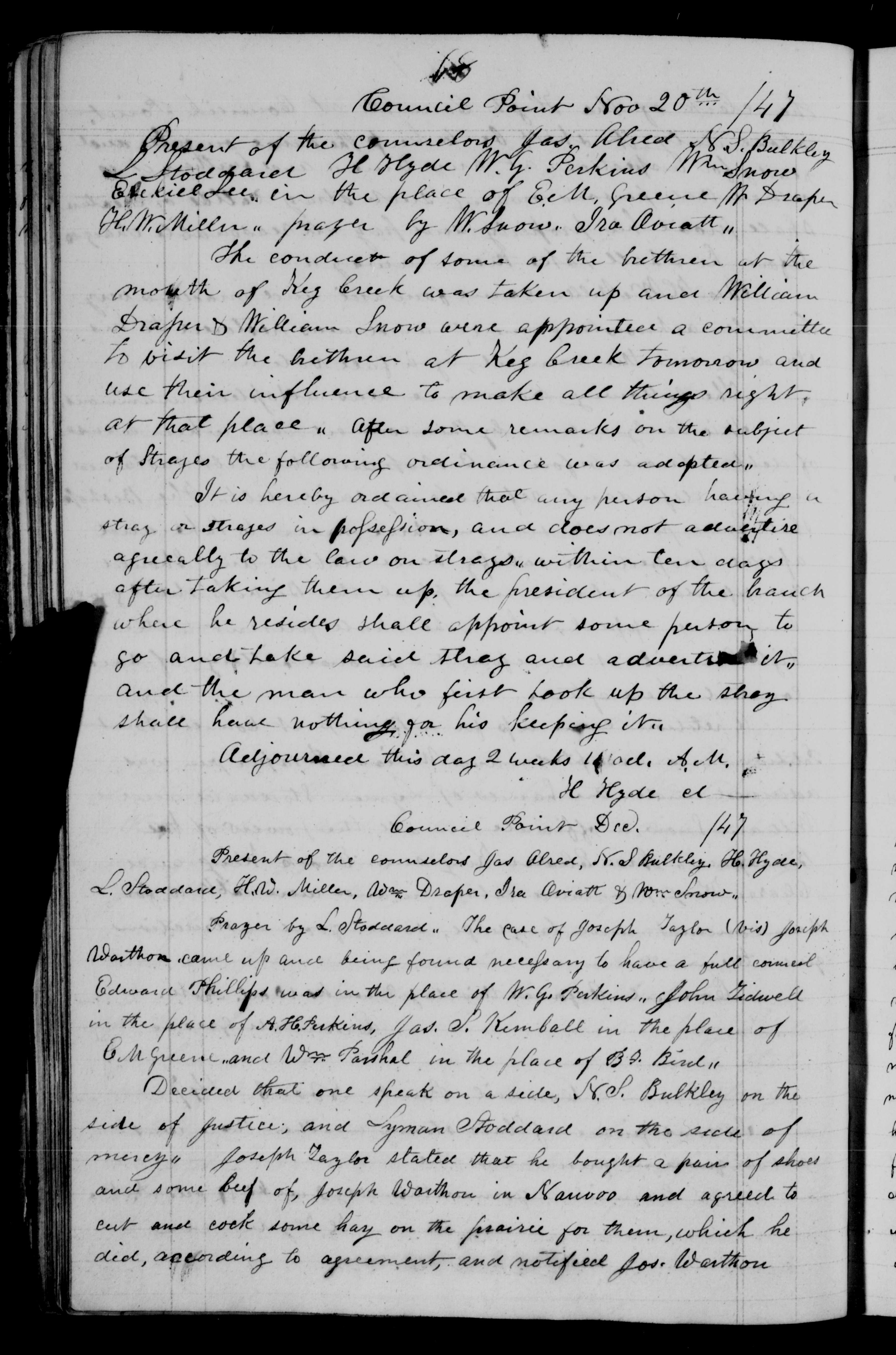 Present of the counselors Jas Alred, N, S. Bulkley, H. Hyde,