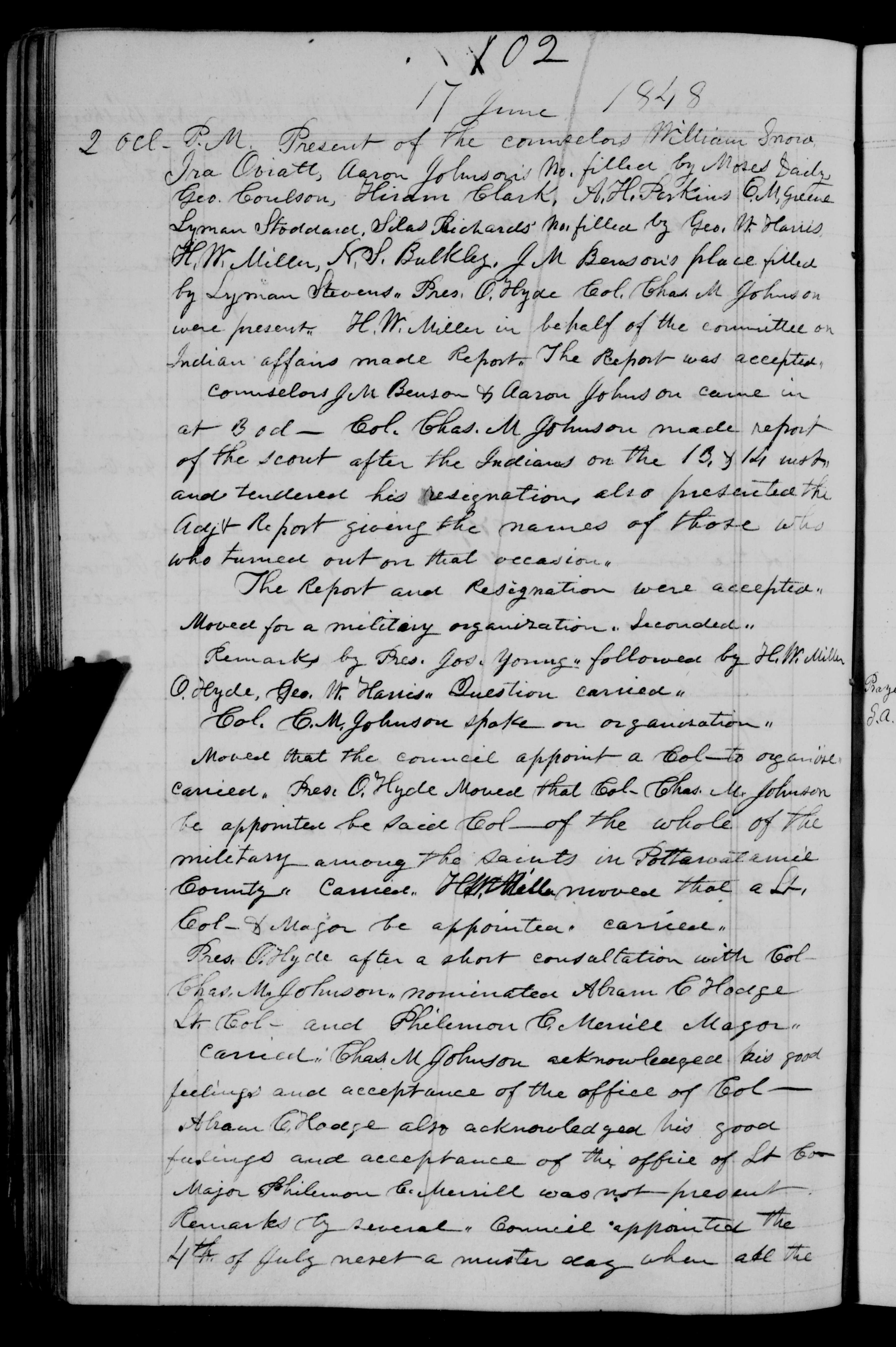 by Lyman Stevens.. Pres. O. Hyde Col. Chas. M. Johnson