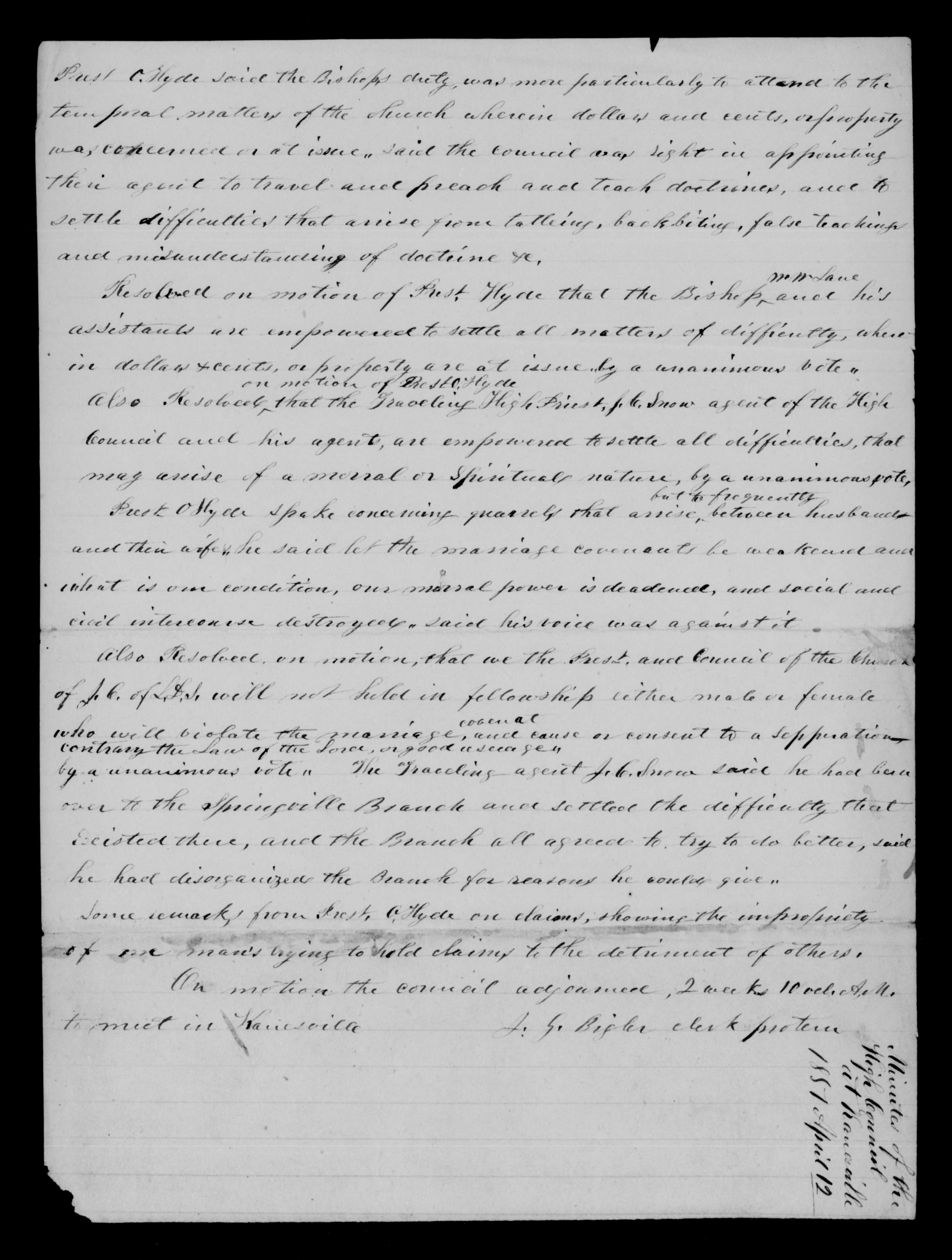 also resolved on motion of Prest O. Hyde that the traveling high Priest M. C. Snow agent of the High